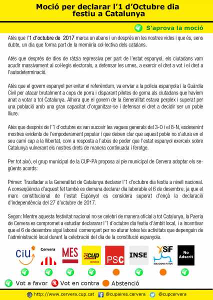 Per tot això, i perquè aquest dia persistirà a la memòria de tots nosaltres, la CUP de Cervera hem proposat al darrer Ple municipal d’instar la Generalitat a declarar l’1 d’octubre dia festiu a nivell nacional, així com declarar dia laborable el 6 de desembre, ja que el marc constitucional de l’estat espanyol es considera superat d’ençà la declaració d’independència del 27 d’octubre de 2017. La resposta del Ple, davant la nostra proposta presentada en forma de moció, ha estat aprovar-la per àmplia majoria, només amb les abstencions del PSC i del SiF.
